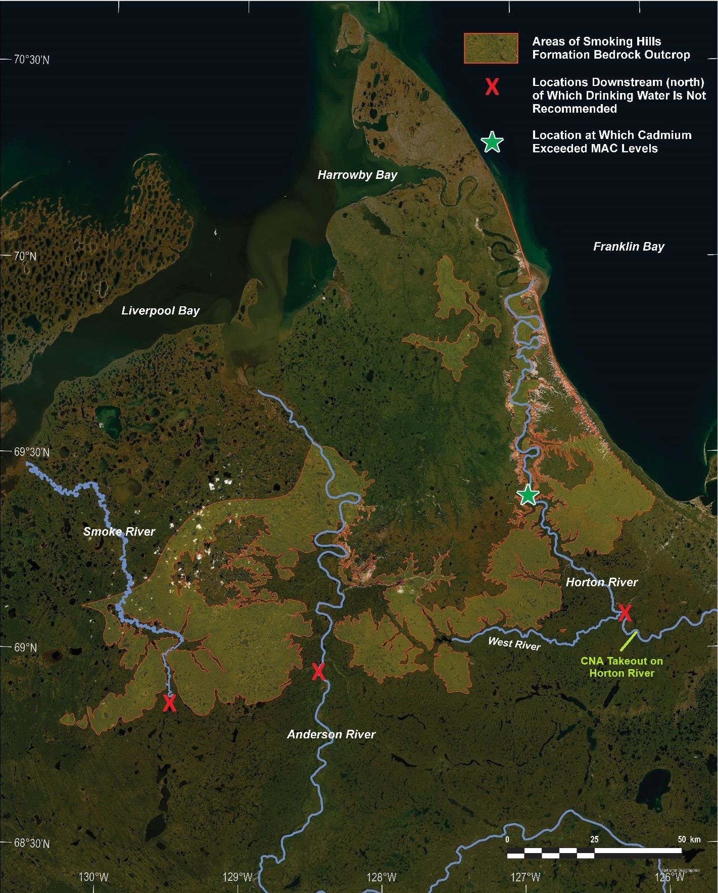 This itinerary ends approximately 11km upstream of the Smoking Hills, a 5000km2 region in the NWT bording the Arctic coast of naturally occuring intense geological activity, where the ground itself literally smokes and burns due to its unique composition of lignite shale and Magnesium. Through recent studies by the Natural Resources Canada, this landscape has been shown to be mildly toxic, poluting the water quality in the Horton River as it carves through it. As such we have discontinued travel to the coast, and finish our trip after the most spectacular part of the river ends, and before the water quality in the Horton drops below where it meets the West River.